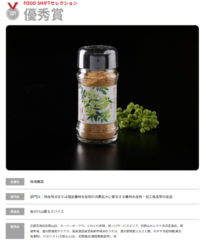 産業として存続の危機にあった有田川町のぶどう山椒をどうにかしたいという想いで脱サラUターン移住して、好き嫌いの分かれる山椒をもっと沢山の人に好きになってもらいたいという想いで作ったこのスパイスがこの部門で評価して頂けたのは嬉しい限りです。